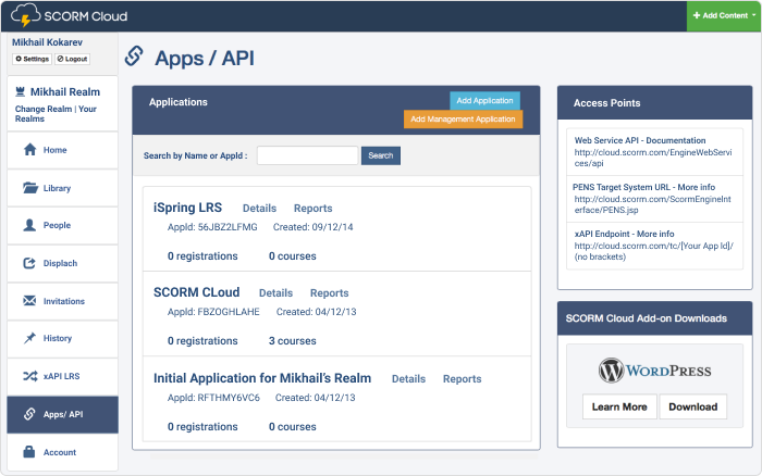 SCORM Cloud é desenvolvido por Rustici Software, a líder global nos padrões de e-learning. É o produto mais conhecido para testar módulos SCORM. Logs de depuração detalhados ajudarão você a solucionar quaisquer problemas reportados que seu conteúdo possa ter.